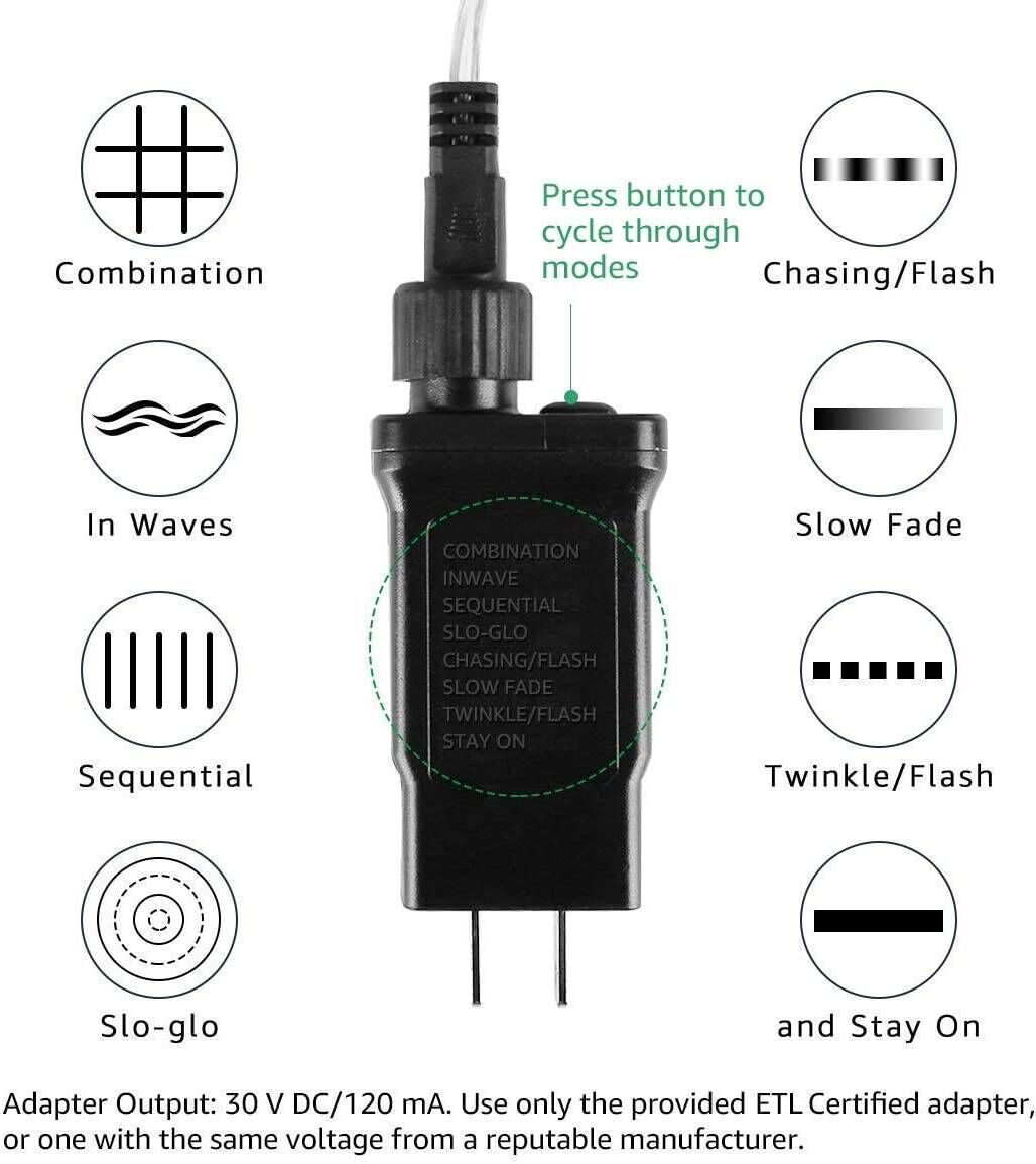 7 Changing Modes and 1 Steady On Mode: Press the button on the transformer to choose from the 8 different light effects: Combination, In Waves, Sequential, Slo-glo, Chasing/Flash, Slow Fade, Twinkle/Flash, and Steady On.